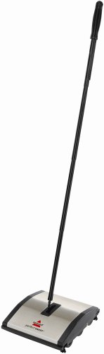 The sweeper features durable steel construction with a long slender handle. The handle is flexible to allow it to stand erect or fold flat to slip under beds, dressers and other furniture. The brushes deposit dirt and debris into twin dirt pans. The spacious dirt pans remove from the sweeper body without difficulty for proper disposal in a trashcan. The sweeper accommodates bare floors and carpets of varying depth and thickness, automatically adjusting the sweeping height to the floor’s ideal level. This item works best for light, daily clean up in conjunction with occasional use of a heavy-duty power vacuum. Bissell offers a lifetime warranty for the sweeper. The sweeper measures 9-1/2 by 10-1/2 by 43-1/4 inches and weighs 4 pounds upon shipping. –Jessica Reuling